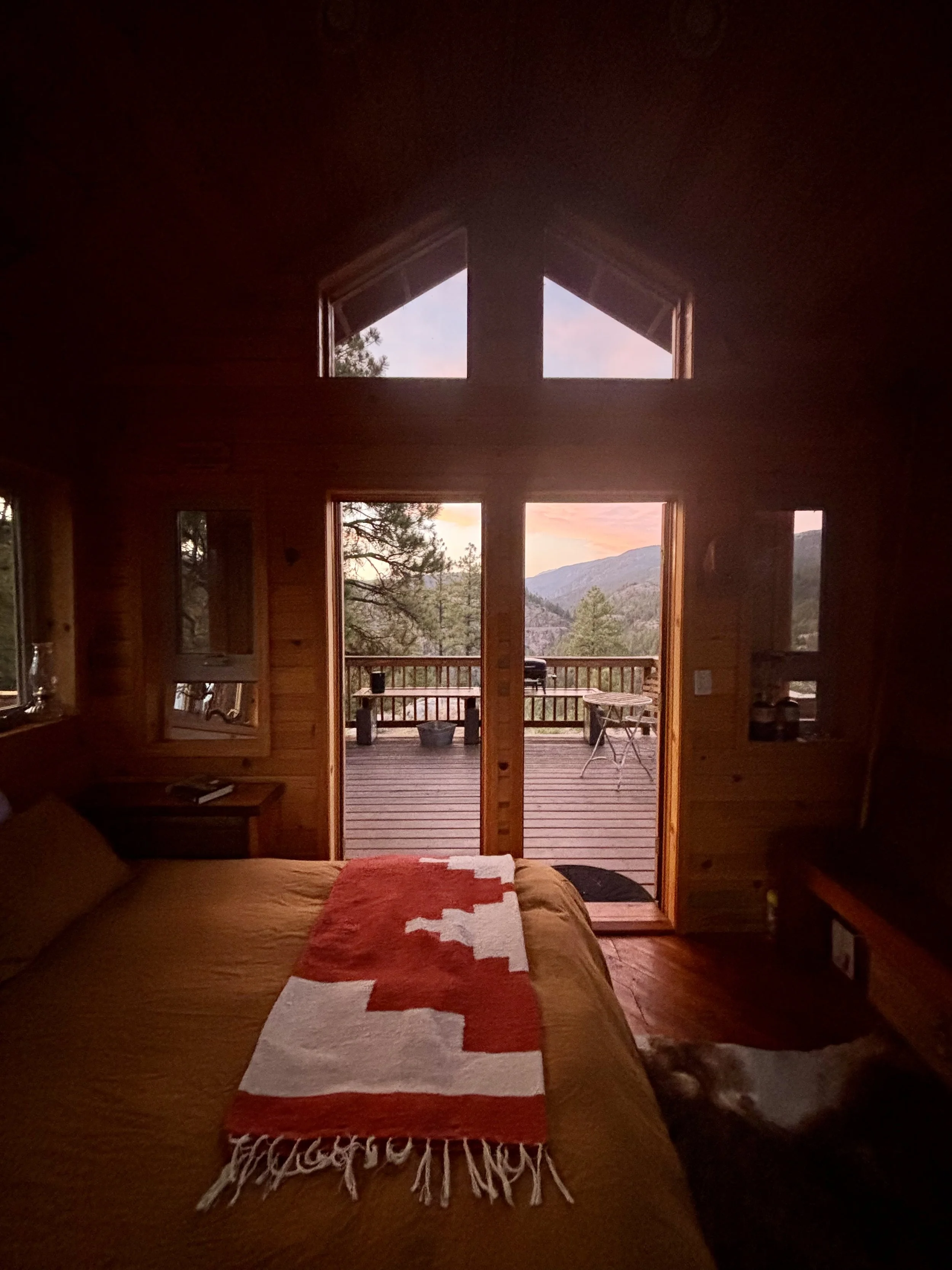 Inside a wooden cabin bedroom with a view of a deck, trees, and mountains at sunset through large glass doors.